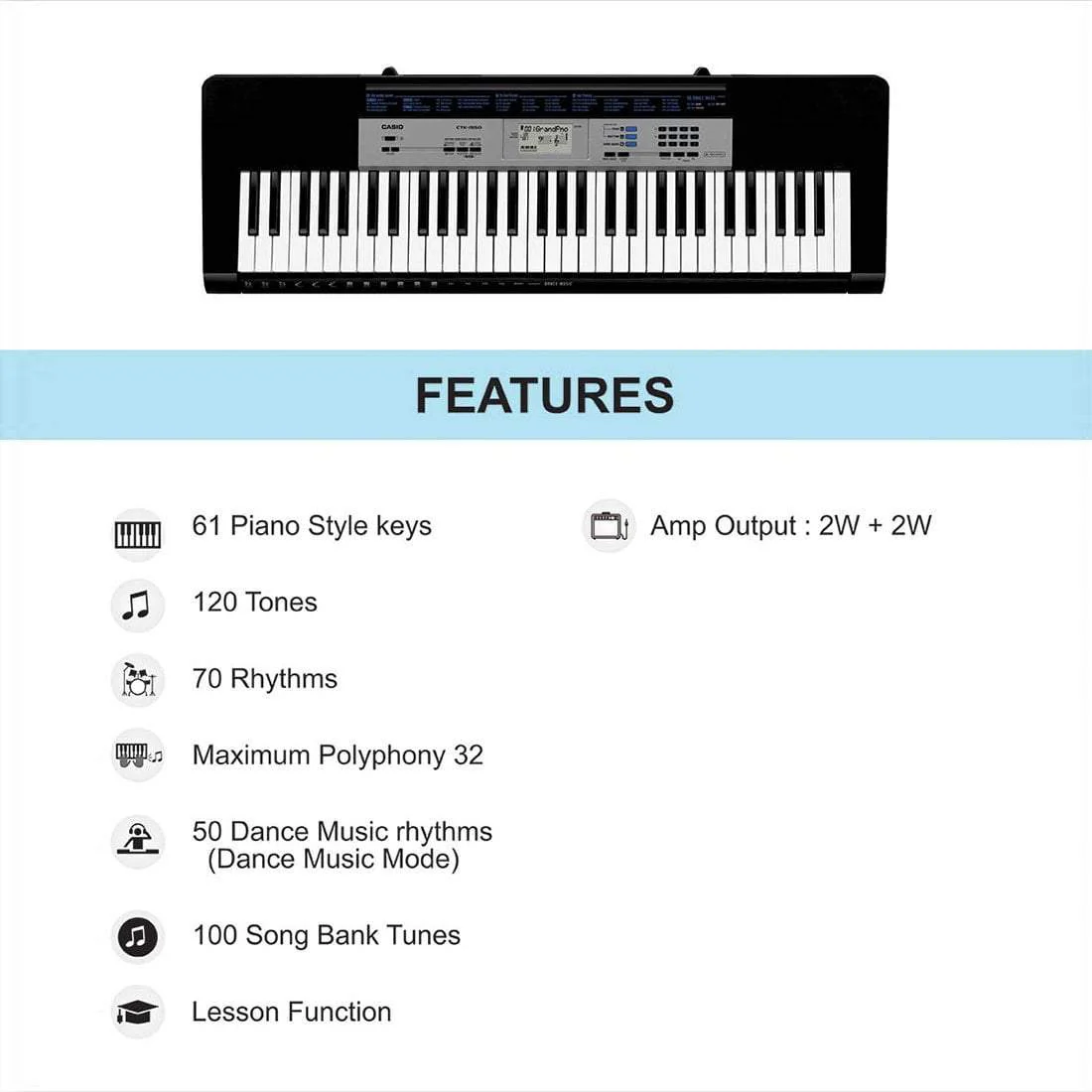 61 keys, 32 Polyphony, 120 Tones and 70 Rhythms and 50 Dance Music Rhythms